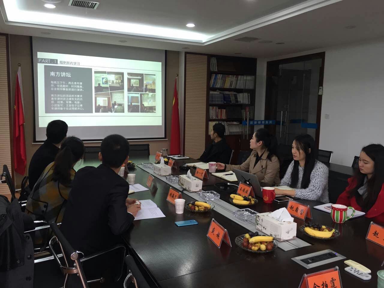 我所王媛媛律师用PPT 展播的形式向莅临嘉宾对我所团支部工作情况做了介绍。其后,我所青年律师介绍了各自的业务方向以及参加团组织活动情况。