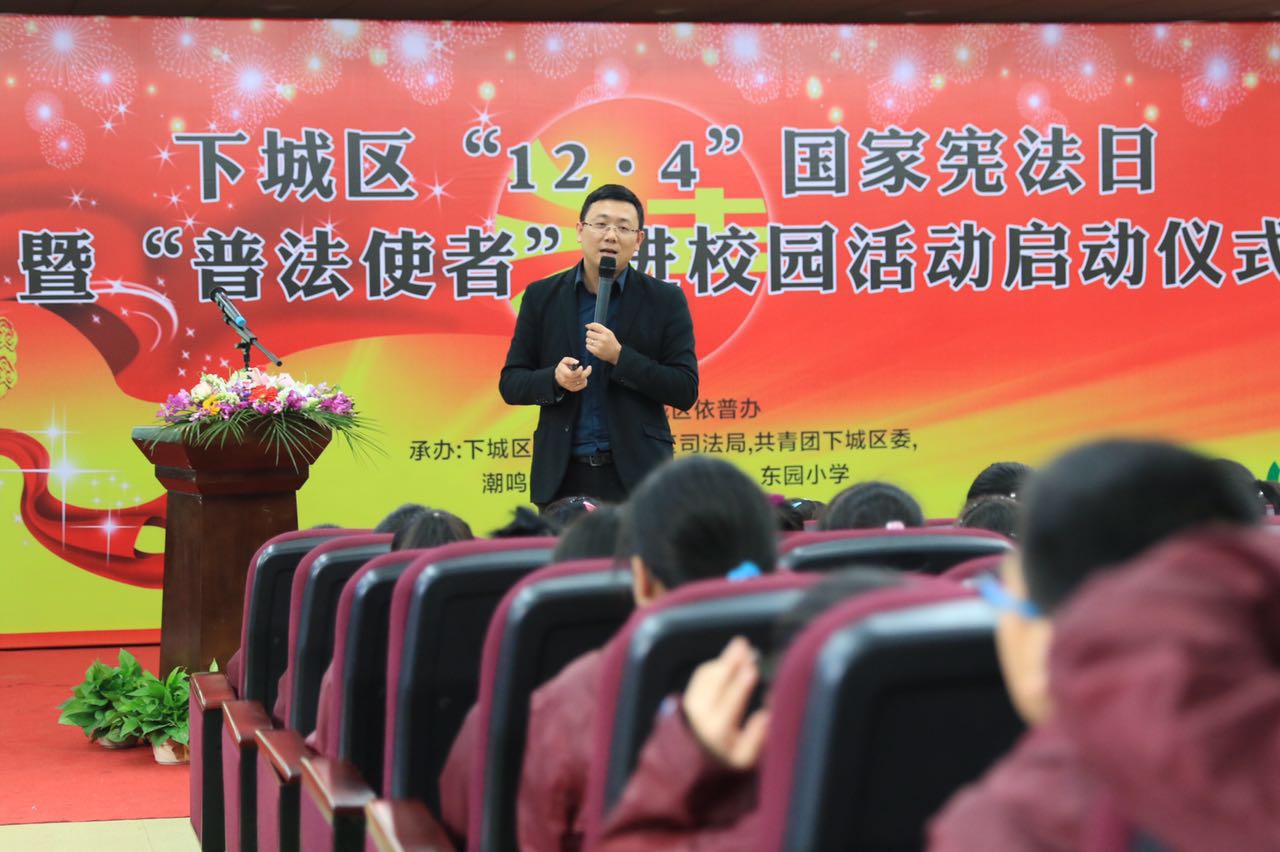 为进一步加强青少年法治教育,让法治精神浸润校园,12月2日下午,杭州市下城区依普办、区教育局、区司法局、团区委和潮鸣街道党工委、办事处在杭州市东园小学举办下城区“12·4”国家宪法日暨“普法使者”进校园活动启动仪式。浙江省司法厅法宣处处长桂漪雯,杭州市司法局副局长吴建华,下城区区委副书记、区委政法委书记杨国琴,区人大常委会副主任王守全,区政协副主席周钢等领导出席。下城区依普办常务副主任、司法局局长黄向阳主持仪式。