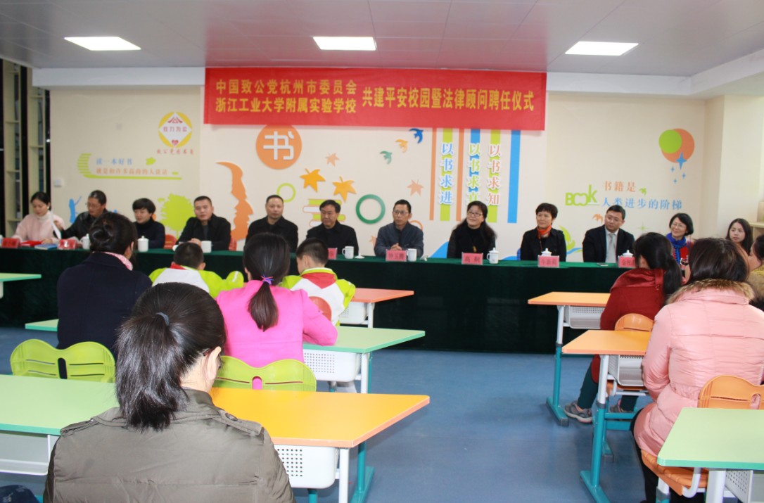 12月4日,为进一步加强宣传法治社会、共建平安校园,致公党杭州市委会和浙江工业大学附属实验学校开展“共建平安学校暨法律顾问聘任仪式”活动,市委会秘书长、社会服务委员会主任钟玉腾,西湖总支主委高舸,市委会办公室副主任吴煜华浙江工业大学附属实验学校校长唐跃华,市委会社会服务委员会法律服务团副团长、浙江君策律师事务所主任林忠再我所合伙人金柏霆,市委会机关部分干部、西湖总支部分成员及校方部分师生家长共40多人参加。