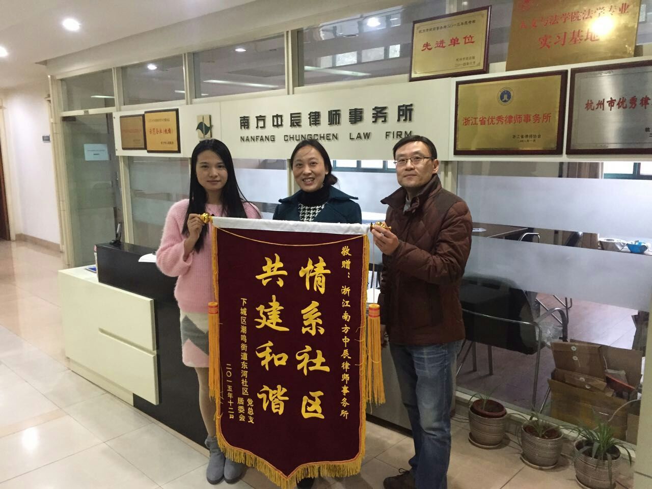 2016年1月12日下午,东河社区陆建红书记向我所赠送了题为“情系社区、共建和谐”的锦旗,感谢我所律师自2010年以来每周定期为社区居民及工作人员提供法律咨询等法律帮助。王媛媛律师作为该社区的社区律师,代表我所接受了锦旗,并表示今后依然会发挥社区律师的法律作用,真正为人民做好事、做实事。”