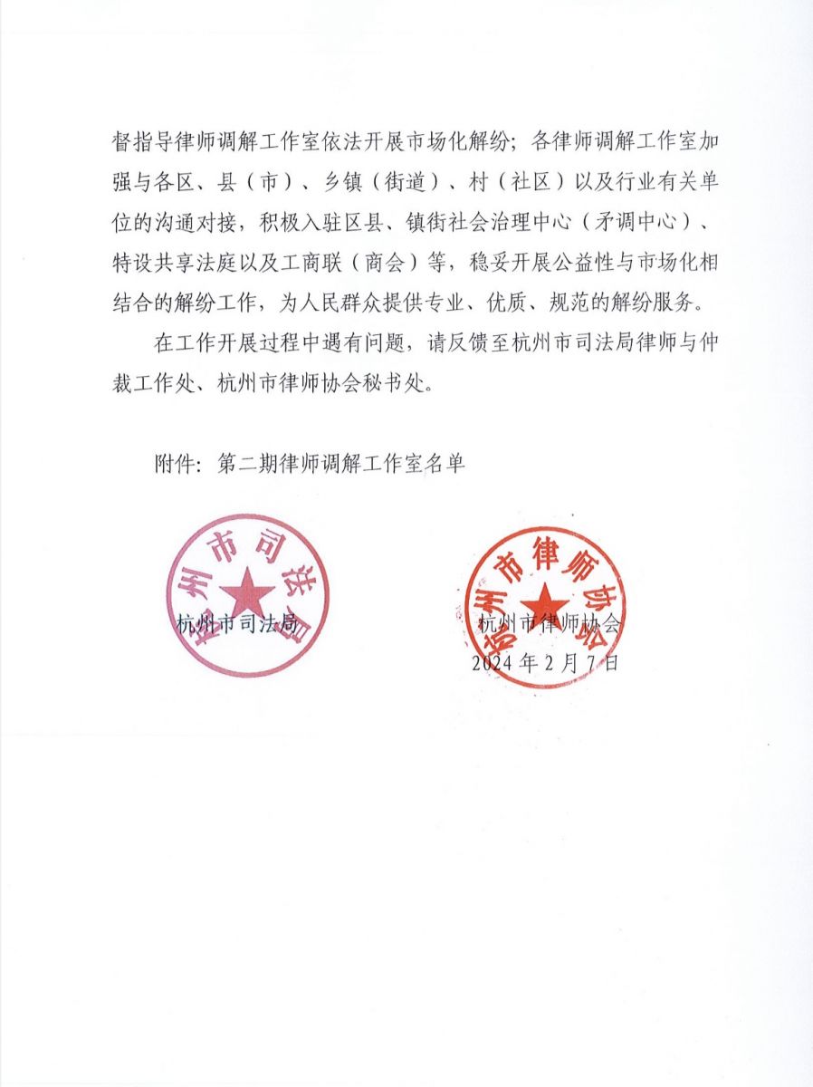 为进一步凝聚解纷力量,鼓励更多符合条件的律师事务所参与市场化解纷工作,充分发挥律师调解的专业、职业和实践优势,依据杭州市中级人民法院、杭州市司法局、杭州市律师协会联合印发的《杭州市律师事务所调解工作室准入退出规则(试行)》要求,浙江南方中辰律师事务所积极申报并成功入选杭州市第二期律师调解工作室名单。