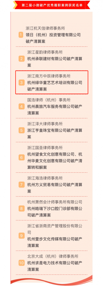 2024年12月,杭州市破产管理人协会开展“第二届小微破产案件优秀履职案例”评选活动,本所承办的杭州绿华童艺艺术培训有限公司破产清算一案喜获表彰。