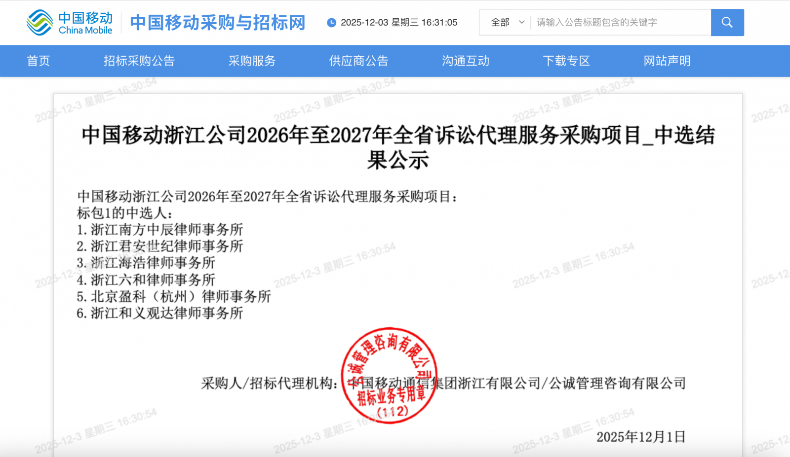 近日,在中国移动浙江公司2026年至2027年全省诉讼代理服务采购项目中,浙江南方中辰律师事务所凭借深厚的行业经验、卓越的专业实力以及高效的团队协作水平,以最高分中标该项目。
